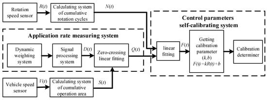 Block diagram of a closed-looped control strategy for the application rate control based on the parameter self-calibrating system.