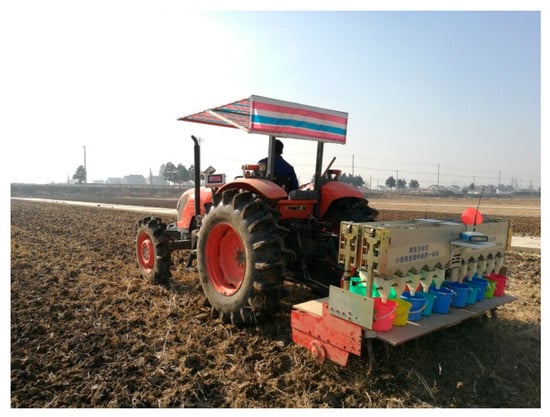 The entire testing process was performed in a field which lies in the South Jiangsu Province in China. The experimental equipment with the application rate measuring and control system was installed on a rotary tiller. There were 10 seeding units and six fertilizing units installed in the seed-fertilizer drill machine. The maximum capacity of the seed tank was 80 kg, and that of the fertilizer tank was 100 kg. The operation width of the seed-fertilizer drill machine was 2.3 m, and the drill machine was attached to an 80 hp tractor. During the operation, wheat seeds and compound fertilizer were fed simultaneously to the rotary fluted rollers. To evaluate the performance, collection bins were placed underneath the seeding and fertilizing outlets. Figure 5 shows the actual experimental setup.