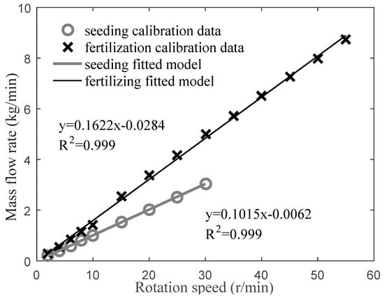During each calibration test process, the driving shaft rotation speed of the fluted rollers was controlled to rotate at a constant speed at different set speeds for 3 min. By weighing the actual material collected in the output bins, the relationship model between the mass flow rate and rotation speed was established, as shown in Figure 6. The ratio coefficients of seeds and compound fertilizers were 0.1015 kg per rotation and 0.162 kg per rotation, respectively.