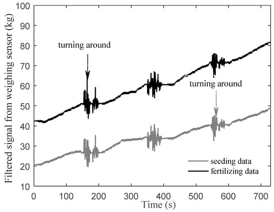 To illustrate the data processing results of each step, one of the test results in the first test stage was taken as an instance in which the target application rate of seeding and fertilizing were 375 kg/ha and 525 kg/ha, respectively. First, the cumulative increment signal D(t) of seeds and compound fertilizers were measured by the application rate measuring system, as shown in Figure 7. The large fluctuation in the signal was due to the lifting and lowering of the tractor when the tractor turned around.