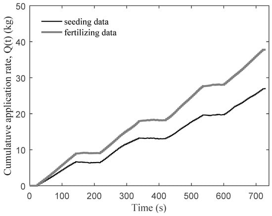 Secondly, the zero-crossing linear fitting between D(t) and S(t) of the fertilizing and the seeding area was carried out, and the dynamic cumulative application rate information Q(t) was calculated, as shown in Figure 8.