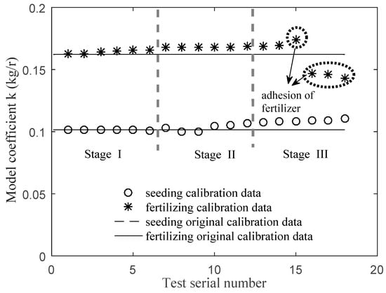From the test results, it can be observed that the calibration relationship model was relatively stable for a short period. However, the model parameters for the fertilizing varied more obviously than those for seeding, probably due to the fertilizers being more prone to moisture absorption and their working performance being affected easily by environmental changes. The relative deviation of model parameters increased significantly with usage-time increase or environmental changes.