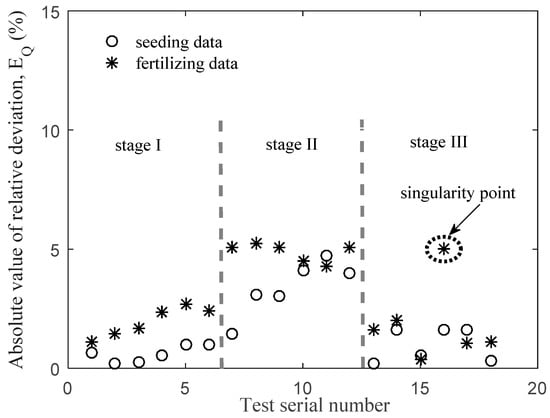 In the third test stage, the relative deviation of the ratio coefficient k further increased. Deformation or damage in the brushes appeared relatively more frequently than in the first two test stages. Further, the increased moisture absorption by the fertilizer resulted in partial caking and bonding in the rollers and brushes. These phenomena can potentially be the reason for the deviation from the original calibration relationship model. However, the relative deviation of the cumulative application rate did not increase with the increase in the ratio coefficient k. Conversely, it decreased to a relatively lower level, similar to the initial test stage. This is because the parameters of the self-calibrating system was in action and the closed-looped control effectively counteracted the negative effects of the parameter change on the control object. This indicates that the dynamic calibration on the parameters of the control model had been realized.
