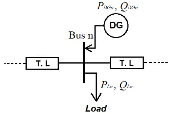 As earlier mentioned, the effect of DG units strongly depends on the type of DG unit. Generally, four major types of DG are classified, based on their real and reactive power delivering the capability [36], as shown in Table 1. Considering the single line diagram shown in Figure 1, assuming the real power output of DG connected to bus n is PDGn, the DG reactive power output is QDGn, the DG power factor is PFDGn, the real power of the load connected to bus n is PLn, the reactive power of the load connected to bus n is QLn. Then the active and reactive power injected at bus n, where the DG is located, are given by [39]: