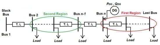 Consider a distribution system shown in Figure 2, assuming that the DG is inserted at bus number n. Hence, the system can be divided into two regions; the first region is from bus n to the last bus of the system, while the second region is from the second bus (after the slack bus) to the bus before the DG (n − 1). The loads in the first region are preferred to be fed from the DG, in order to minimize the resistance of distribution line which the current passes through, therefore the power losses are minimized in the system.