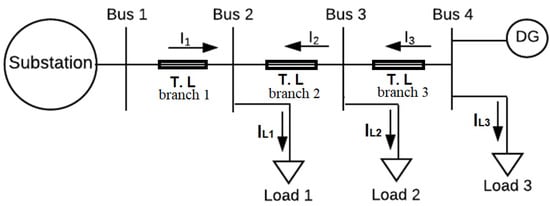 After determining the critical bus when the DG is installed at each bus, optimal active power and reactive power of the DG that minimize the power losses in the network can be derived and achieved. Consider a distribution system shown in Figure 4 which represents a simple case where the DG is inserted at bus 4, and assumed that the critical bus is found at bus 2, Kirchhoff’s current law is applied at each bus and Equations (7) and (8) can be obtained.