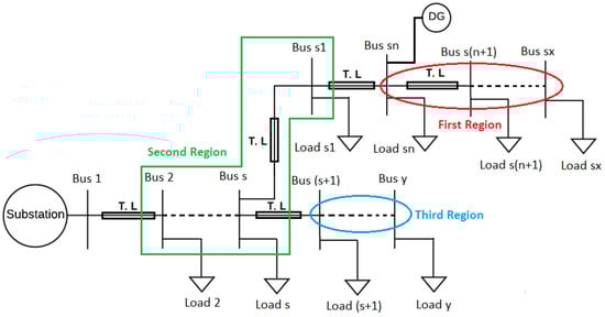 If the system has a sub-branch, such as the distribution network shown in Figure 5 where the sub-branch is in bus s, the system should be divided into three regions. If the DG is desired to be installed at bus sn, the first region is from bus sn to bus sx; which is preferred to be fed from the DG. While, the second region is from bus 2 to bus s and from bus s to bus s1, in this case the same procedure for the second region in the normal case which is without sub-branches is proceeded. The third region is from bus s + 1 to bus y; these three regions are illustrated in Figure 5. In this particular, the resistance of the distribution lines from the substation to bus s and the resistance of the distribution lines from the DG to bus s are compared and the minimum resistance between these two resistances is chosen in order to reduce the power losses. So, in this case, DG capacity can be represented mathematically in order to be implemented in the algorithm as: