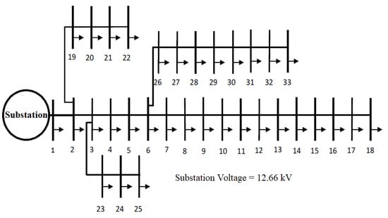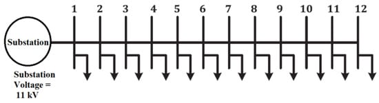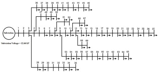The proposed approach has been tested on two different distribution systems; the first one is a 12-bus system with the total active and reactive peak load of 435 kW and 405 kvar respectively, and the total real power loss of 20.7 kW. The single line diagram of this test system is shown in Figure 7. The line and load data for this test system is available in [46]. The second test system, as depicted in Figure 8, contains 33 buses and 32 branches; it is a radial system with the total peak load of 3715 kW and 2300 kvar, and the total real power loss of 211 kW. The line and load data for the 33-bus test system is available in [47]. The third test system which is shown in Figure 9 is 69-bus radial system, it has the total active and reactive peak load of 3802.19 kW and 2694.60 kvar respectively, and the total real power loss of 225 kW. The detailed data for this system appear in [48].