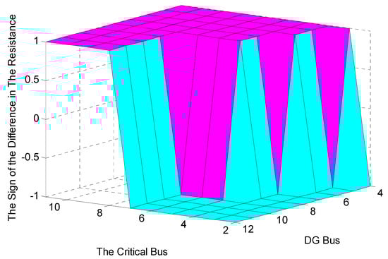 The critical bus, when a single DG is added at a generic bus, is determined by referring to the flowchart of Figure 3. Figure 10 represents the sign of the difference in impedances. The critical bus is the last tested bus which has negative sign in the difference of the resistances. As an example, if the DG is interconnected at bus 8, the critical bus will be bus # 4. And if the DG is interconnected at bus 10, the critical bus will be bus # 7.