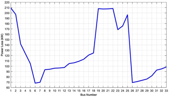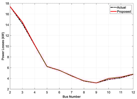 Power losses when the DG is connected to each bus with the optimal parameters.