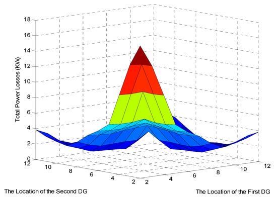 In order to deal with the case of multiple DGs interconnection. The previous part has been repeated for more than one DG and as an example two DGs are considered. Figure 12 represents a 3D plot of the total power losses with respect to the location of the two DGs added to the system; the diagonal of the x-y plane (locations of the first and second DGs) represents the case of two interconnected DGs on the same bus and simply it can be considered as the case of interconnected single DG. However, it is noticed that for all bus numbers, the single DG added to the system results in higher power losses than the case of two DGs added to the system. Moreover, it is noticed that the optimal location of the first DG in order to reduce the power losses as much as possible is at bus 7, and the location of the second DG is at bus 10. Table 4 presents a comparison between the values of proposed method and the actual ones for the case of 2 DGs interconnection. It is clear from the results that the processed method has an excellent accuracy and the values are very close to the exact ones.