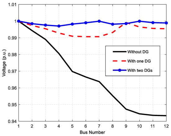 Voltage profile of 12-bus distribution test system is shown in Figure 13, the “Without DG” curve shows the voltage profile for the original test system and this curve identify that the minimum voltage occurs at the end of the feeder. In addition, it is observed that the voltages at all buses are within the acceptable voltage range. It is clear that the bus voltages will enhance when DGs are optimally connected in the electrical distribution system.