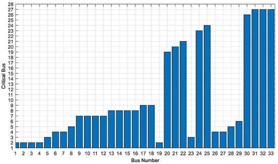 Referring to the proposed method and considering the case when a single DG is interconnected at each bus, Figure 14 shows the critical buses. After that, assessing the optimal penetration level of the DG at each bus in the network is required; finally, the optimal location that minimizes the power losses in the network is evaluated. The power losses have been calculated when the DG is installed at each bus as presented in Figure 15 which shows that the minimum power losses that can be achieved when a single DG unit is added at each bus. As a result, it is noticed that the minimum power losses is 67.75 kW and occurred when the DG is added to the bus 6 with penetration level of 70.444% and power factor of 0.8255.