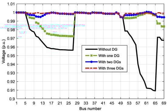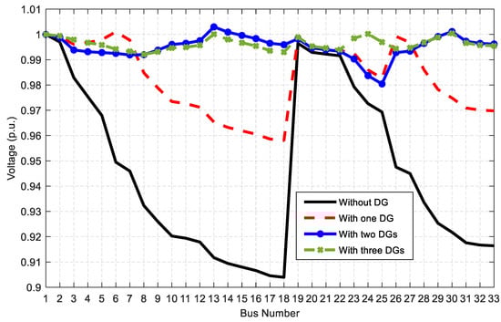Regarding the voltage profile for 33-bus test system, it is clear from Figure 16 that the presence of DG in the system improves the voltage profile. The case of interconnecting more than one DG provides more voltage improvement. However, the improvement in the voltage profile in the case of two DGs and three DGs are nearly the same.