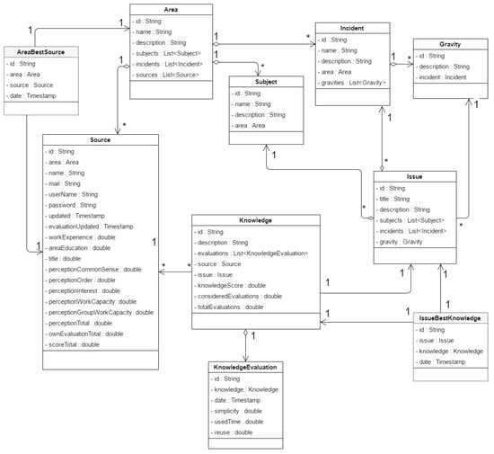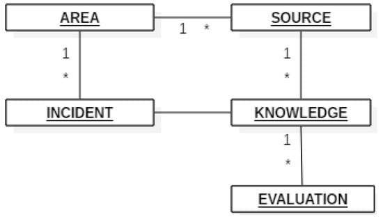 Figure 2 shows the components of the model (area, incident, source, knowledge and rating) and the cardinality relations between them. These components are processed in the different phases of the GESTAC model in order to meet the objectives of each of the knowledge management phases.