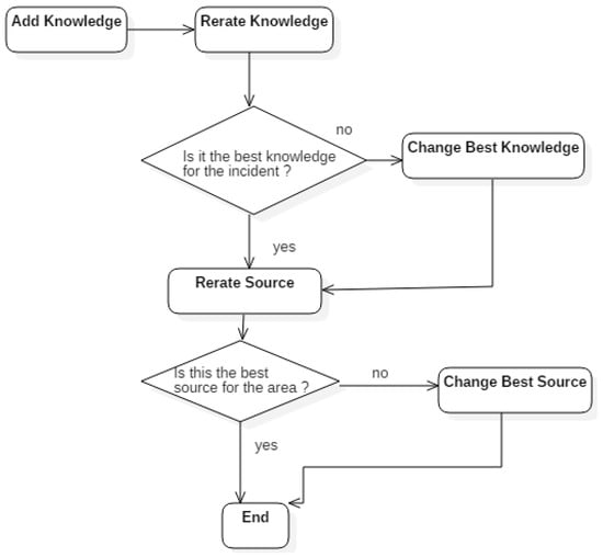- Simplicity (S(y)): number of activities required to resolve the incident using the knowledge provided according to the results of the surveys taken, referred to by ITIL as incident resolution effort. Figure 3 shows the source and knowledge rerating flow. The system compares the knowledge ratings with each other and saves the best knowledge per incident. The source reratings are determined by the knowledge reratings for sources.