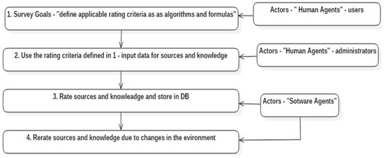 The goal of this model is to account for the influence of knowledge quality on the source’s rating. Each knowledge rating generates a rerating of the source, which is calculated based on the results of (1), (2), (3) and (4), leading to source rerating, summarized in (5). To do this, we take into account the source’s original confidence rating, the source’s rating of his or her own knowledge, and the average knowledge rating by all users, without losing sight of the fact that the source is a qualified person and his or her opinion should be represented in the rerating. We generate a rule of three, Equation (6), where the unknown is a new source rating value (with respect to evaluations) based on the source rating, source’s knowledge evaluation and the average knowledge evaluation.