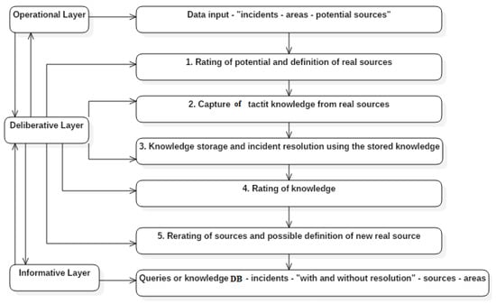 The GESTAC functional design is divided into three interactive layers (Figure 6): operational layer (input: incidents, areas, potential sources-> output: incident logging, areas, potential sources and specified knowledge), deliberative layer (transformation of potential into real sources, rating of captured knowledge, rerating of sources and knowledge) and informative layer (on-demand or other interfaces between agents). Figure 6 shows that the GESTAC model complies with all tacit knowledge management phases. The tasks of tacit knowledge identification, capture and storage are carried out in the deliberative layer. The distribution of captured and registered knowledge is carried out in the informative layer. The operative layer is designed for data input used by both the deliberative and the informative layers (i.e., to enter company areas, sources, incidents). This layer is associated with potential problem-solving knowledge, which is one of the interesting innovations of the GESTAC model.