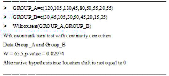 Finally, the statistical result obtained was validated by means of the Mann–Whitney U-Test and Wilcoxon Rank Sum Test, the results of which are shown in this section and in Table 9. These studies make it possible to check the frequency distributions by comparing groups A and B, and in short, to check whether the results obtained would be the same by carrying out another number of tests. According to the results shown in Table 9, we can be conclude that the p-value increases as the number of tests drops, and at least 7 tests are required for the H0 to be rejected.