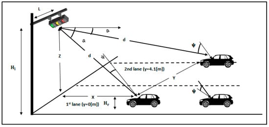 The angle φ in Figure 1 represents the irradiant angle, which is the angle between the irradiance ray and the line of the transmitter surface normal, while the angle of incidence, ψ, is the angle between the incident ray and the line of the receiver surface normal. = 5.3 m represents the height of traffic light, = 1 m represents the height of the receiver itself from the road, and z is the height difference between and , as used in [12,13].