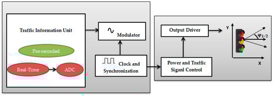 In practice, to ensure that the transmitter is synchronized, the modulator often receives information from the traffic information unit so that it can retain information while the light color varies. Then, the switching of the LED is controlled by the output signal through the output driver. In order to obtain the foreseeable range of communication, the output driver coupled with the control signal should provide enough optical power. The VLC data rate is limited by the switching speed of LEDs. On the other side, long-distance communication is restricted by transmitting power and ambient light sources [14].