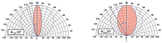 The chosen angle has a noticeable impact on the coverage range and pattern shape of the Lambertian light source, according to Figure 3 [15].