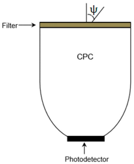 To achieve near-ideal performance, a 10 nm band-pass filter can be coupled with a CPC having a FOV = 10°, which has been indicated in [16,17]. In order to achieve the maximum area of reception, vertical inclination and FOV angles must fulfill the term below [18].