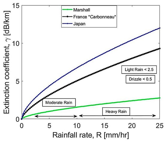 The explanation for this disparity is that the Marshall model underestimates light rain intensities and (drizzles) on the one hand and high rain intensities on the other hand. The Marshall model is only an average distribution, which made it not accurate and almost gives an attenuation behavior in light rain intensities as very clear weather or less, as shown in Table 5. France models were tested at low rates, while Japan was calculated at higher rates of up to 50 mm/h, as mentioned in [23]. The rate up to 25 mm/h is considered as an acceptable range of precipitation rates in this paper to make a reliable comparison. Rainfall rates are taken from Ref. [25].