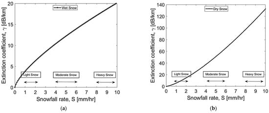 Using Equation (18) and Table 3, the effect of snow attenuation can be predicted. Snowfall rates are taken from Ref. [10]. Figure 8a,b shows the relationship between the extinction coefficient and snowfall rates estimated for two forms of snow. It is clear that the attenuation induced by wet snow is too small compared with the attenuation caused by dry snow at higher rates.