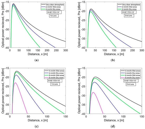 Optical power received vs. distance for (a) very clear weather and 2 mm/h wet, dry snow in the first lane (b) very clear weather and 2 mm/h wet, dry snow in the second lane (c) 4, 8 mm/h wet, dry snow in the first lane (d) 4, 8 mm/h wet, dry snow in the second lane.