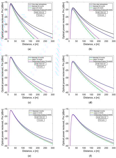Optical power received vs. distance for (a) very clear weather and different rain models at 25 mm/h in the first lane, (b) very clear weather and different rain models at 25 mm/h in the second lane, (c) different rain models at 10 mm/h in the first lane, (d) different rain models at 10 mm/h in the second lane, (e) different rain models at 2 mm/h in the first lane, and (f) different rain models at 2 mm/h in the second lane.
