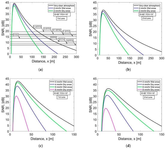 Signal-to-noise ratio vs. distance for (a) very clear weather and 2 mm/h wet, dry snow in the first lane, (b) very clear weather and 2 mm/h wet, dry snow in the second lane, (c) 4, 8 mm/h wet, dry snow in the first lane, and (d) 4, 8 mm/h wet, dry snow in the second lane.