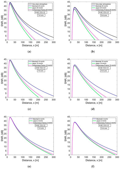 Signal-to-noise ratio vs. distance for (a) very clear weather and different rain models at 25 mm/h in the first lane, (b) very clear weather and different rain models at 25 mm/h in the second lane, (c) different rain models at 10 mm/h in the first lane, (d) different rain models at 10 mm/h in the second lane, (e) different rain models at 2 mm/h in the first lane, and (f) different rain models at 2 mm/h in the second lane.