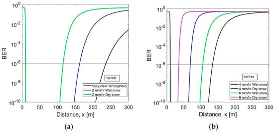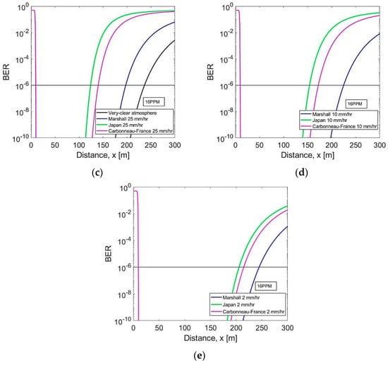 Bit error rate vs. distance under 16PPM scheme for (a) very clear weather and 2 mm/h wet, dry snow, (b) 4, 8 mm/h wet, dry snow, (c) very clear weather and different rain models at 25 mm/h, (d) different rain models at 10 mm/h, and (e) different rain models at 2 mm/h.