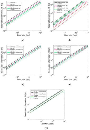 Received information (RI) vs. data rate under 16PPM and I-16 PPM schemes for (a) very clear weather and 2 mm/h wet, dry snow, (b) 4, 8 mm/h wet, dry snow, (c) different rain models at 25 mm/h, (d) different rain models at 10 mm/h, and (e) different rain models at 2 mm/h.
