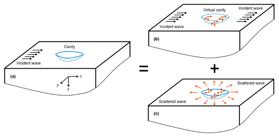 Figure 1, the scattered field is equivalent to the field generated by the application of a distribution of the tractions applied on the surface of the cavity. These traction components are equal in magnitude but opposite in sign to the corresponding tractions due to the incident wave on a virtual cavity in the half-space without the cavity. Therefore, they can be computed from the stress components of the incident Rayleigh wave and the outward normal vectors of the cavity. It should be noted that for the scattered problem given in