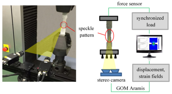 To determine the distribution of η in the specimen center and to extract its representative value, the local displacement and strain distributions were measured optically using DIC. The test setup is shown in Figure 1. Prior to the test, an irregular, high-contrast speckle pattern was sprayed onto the specimen surface. The pattern was then recorded during the test using a stereo camera (resolution 1280 × 1024 pixels) with one frame per second, and after the test, the pattern changes were converted to displacements and strains in GOM (Gesellschaft für Optische Messtechnik mbH) Aramis Professional (2019) [13].