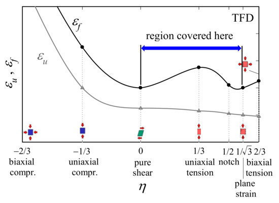 where σm, σeq, σ1, and σ2 are the mean stress, equivalent stress (here in a von Mises sense), and maximum and minimum principal in-plane stresses, respectively. Note that while εu and εf are triaxiality-dependent material properties, there was only one set of m and f that was found. The variations of εu and εf with η were provided by the TFD, as schematically shown in Figure 2. It is worth noting that the shapes of the curves are material-dependent; the run between two points is unknown. A further parameter, m (≥1), the damage evolution exponent, governs the shape of the damage accumulation law. For m = 1, Equation (1) reduces to the linear damage evolution proposed by Johnson and Cook, and with increasing m, we approach the Gurson model.
