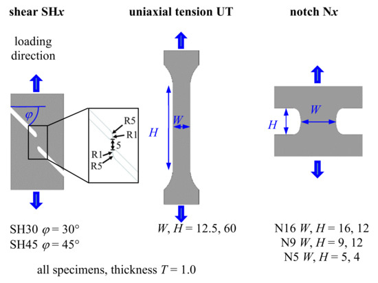 In addition, all of the tests were simulated in FE software LS-DYNA to determine the GISSMO parameters. The FE models were geometrically equal to the real specimens, with the exception that the clamped regions were not modeled. The bottom nodes were constrained in all directions, whereas the top nodes were only free to move in the loading direction. The meshes consisted of second order four-node shell elements with five through-thickness nodes, and the UT specimen FE model is shown in Figure 7. The reference edge length (e) was 2.0 mm, and for regularization, e varied between 0.8~4.0 mm.