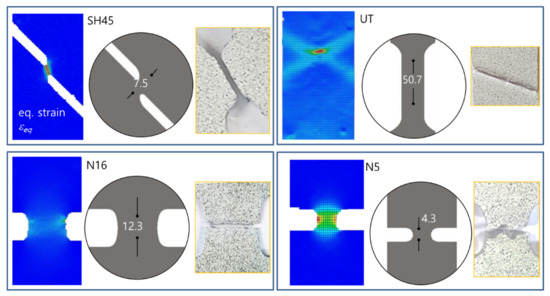 To impose the diverse loading modes necessary to establish the TFD in the region between pure shear and plane strain, the specimen geometries shown in Figure 3 were chosen; the failure regions of each specimen were subject to a constant η value, which will be determined in the next section. The specimens shown in 4 were mounted in a universal testing machine (UTM; Shimadzu AG-X, load capacity 50 kN) and loaded until failure, with a constant velocity of 5 mm/min (UT; uniaxial tension) and 3 mm/min (all of the others). The equivalent strain distribution in the specimen center and the fracture specimens are shown in Figure 4. The displacement data for the FD curves were obtained via DIC using virtual extensometers, and the gauge length for each specimen is the distance between the black points in Figure 4. Every test was performed three times so as to check repeatability. All of the experimental FD curves provided in Figure 5 show an excellent repeatability (as the curves for a certain specimen shape nearly coincide, the differences are difficult to discern).