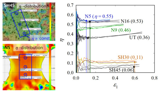 where σ1 is the maximum principal stress, and ε1 and ε2 are the in-plane maximum and minimum principal strains, respectively. The η-values are plotted over ε1 in the center in Figure 6. We observed that η is constant up to a maximum load, Fmax, and then starts increasing. However, as the increase is not pronounced, a representative η-value was determined by taking the average between ε1 = 0.04 and ε1 at Fmax. The problem of the η-increase was not considered here, but it is certainly something that needs more investigation, in particular, for materials more ductile than DP980. Using the average values, we found that η ranges between 0.06 and 0.55 (i.e., roughly between the pure shear and plane strain). Note that the actual η-values may differ from the theoretical ones (Figure 6), as anisotropy was disregarded here.