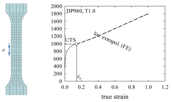 The material was assumed to be isotropic (despite the sheet’s mild anisotropy) and obeyed Mises yielding and isotropic hardening (Young’s modulus of 210 GPa and Poisson’s ratio of 0.3). GISSMO was applied to model the damage. The average FD data obtained with the UT specimens (based on a gauge length of 50 mm) were converted to true stress–strain data, which served as an input to the finite element (FE) model (Figure 7). As the stress–strain data were only accurate up to stress at Fmax (denoted UTS = ultimate tensile strength), the data beyond the UTS were linearly extrapolated; the difference between the assumed and the real stress–strain curves was compensated for by applying GISSMO. A specimen was assumed to have failed once two elements lost their strength completely.