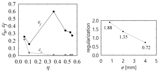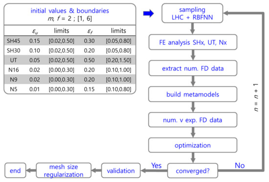 The damage parameters (εu, εf, m, and f) were determined by a metamodel-based optimization performed with LS-OPT. The initial values, together with the lower and upper boundaries for the damage parameters and the optimization flowchart, are given in Figure 8. The initial values for εu and εf were estimated from the experimental data (note that generally, the εf value for UT obtained through optimization differs from the one that would be achieved for the experimental data, because of different degrees of localness). The objective was to minimize, for all tensile tests (SHx, UT, and Nx), the total error between the numerical and experimental FD data, by applying the in-built curve matching algorithm. The numerical FD data were determined based on the same gauge length as that which was used in the tests (50 mm). First, a number of FE analyses were run, starting with the initial values and continuing with the sampled sets of damage parameters (LHC(Latin hypercube)and RBFNN(Radial Basis Function Neural Networks) sampling was used). The FD data were then extracted and compared with the experimental FD data, while a metamodel was being built. The total error (multi-objective) was computed, and the convergence (or not) was judged by comparing the error with the allowed error. If no convergence was reached, the next loop commenced by sampling and running further FE analyses. Once convergence was reached, further analyses were performed with mesh sizes of e = 0.8 and 4.0 mm, so as to mitigate mesh-dependence. The final damage parameters and the resulting TFD together with the regularization curve are shown Table 1 and Figure 9, respectively.