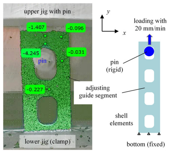 For the validation of the material properties obtained in Section 3, a segment of an adjusting guide (thickness T = 1.0 mm) used in a vehicle was torn by a circular pin, sticking through the upper hole (Figure 11). The whole segment contained four holes, the centers of which were slightly off the vertical center line. The lower end was clamped, as depicted in Figure 11), where the lower two holes were hidden inside the lower clamp; during the test, the pin in the upper hole was displaced at a constant speed of 20 mm/min until failure. Again, DIC was employed to obtain the displacement and strain fields.