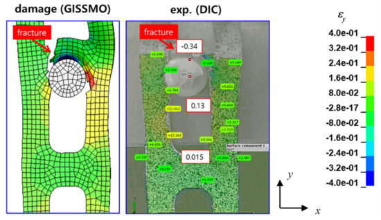 The equivalent strain distributions at fracture are shown in Figure 13. Crack formation was preceded by severe deformation. It was found that the maximum compressive strains in the y-direction (εy) in the part of the guide that was in contact with the pin were of a similar magnitude (−0.34 (test) vs. −0.38 (FE analysis)), and the values in the other regions were also in good agreement. Furthermore, for the experiment and simulation, the crack formed in the same region, namely on the left side of the ligament between two holes, which is subject to high strains, and grows in the y-direction.