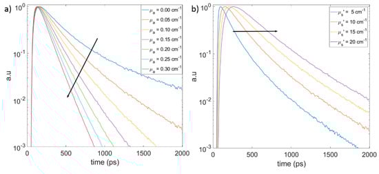 Monte Carlo simulations on a homogeneous semi-infinite medium in reflectance geometry. The source and detector separation is 1.5 cm. Effect of (a) absorption, with the arrow showing the increase in the slope of the distribution of the photon time-of-flight (DTOF) curves with increasing absorption and (b) scattering, with the arrow showing the shift in the peak position of DTOF with increasing scattering.