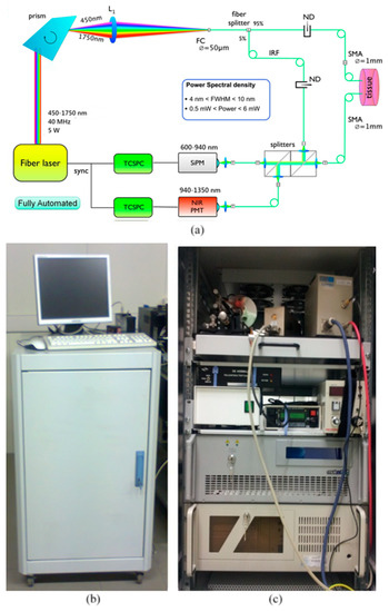 A different concept was based on mode-locked lasers, which were sequentially tuned and permitted the use of single-channel TCSPC detection [57], as shown in Figure 5 [22]. As sources, two tunable mode-locked lasers were used, namely, a synchronously pumped dye laser in the 610–700 nm range and an actively mode-locked Ti:Sapphire laser in the 700–1050 nm range. For detection, a microchannel plate photomultiplier (MCP) with S1 surface (R1564U, Hamamatsu, Japan) was used, followed by a chain for TCSPC (SPC130, Becker & Hickl, Germany). The key complexity of this system resided in the handling of the laser sources. Both of them were tunable lasers whose spectral scanning required delicate alignment to provide optimal lasing over the entire range but also automatic control—operated via mechanical actuators—for rotating the intracavity Lyot’s filters. In addition, the Ti:Sapphire laser demanded automatic switching of the output mirror to avoid spurious laser emission as well as a fine adjustment of the cavity length to compensate for chromatic dispersion. A replica of the instrument response function (IRF) was implemented to compensate for variations in pulse shape and detector response during the wavelength tuning and to provide real-time feedback for automatic optimization of the cavity length. This reference IRF was achieved by splitting a small portion of the laser that was directly fed to the MCP. Despite the inherent complexity of the system, the fully automated operation was achieved, permitting the first acquisition of in vivo absorption and scattering spectra of various biological tissues by time domain diffuse optics over a wide spectral range (600–1000 nm) [61]. Surely, the adoption of TCSPC permitted to reach high sensitivity and dynamic range, and cover the critical region of high water absorption (above 900 nm), where signal attenuation is dramatically increased as compared to the 700–800 nm range.