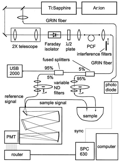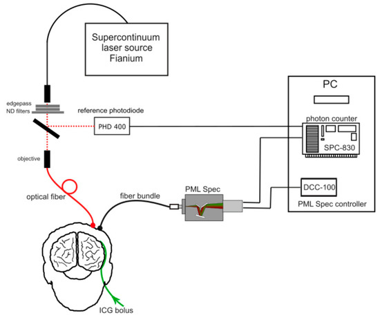 The implementation of a TCSPC detection scheme—granting single-photon sensitivity, but operated in a parallel configuration—required the use of multianode detectors and multichannel TCSPC boards. A realization is shown in Figure 7 [69]. The source was a supercontinuum generated in a photonic crystal fiber (NL-2.4-800, Blaze Photonics, UK) by a self-locking mode-locked Ti:Sapphire oscillator (Tissa 50, CDP Systems Corp., Russian Federa-tion). Diffusely re-emitted light was dispersed by an imaging spectrometer (SP-2150, Acton Research, USA) and detected by a 16-channel multianode PMT (R5900U-01-L16, Hamamatsu, Japan) connected to a TCSPC board (SPC-630, Becker & Hickl, Germany). Routing bits, associated with the PMT channels hit by the impinging photons were processed by the TCSPC router electronics (PML-16, Becker & Hickl, Germany) to separate signals arising from different wavelengths. This configuration enabled the fully parallel acquisition and permitted to track dynamic variations in absorption and scattering spectra following hemodynamic changes. The key constrains were a limited spectral range (520–850 nm) imposed by the available multichannel PMTs as well as reduced dynamics due to the need to accommodate all wavelengths with different signal attenuation in the same acquisition.