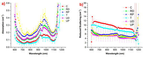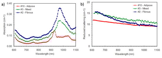 Table 1 displays the results obtained interpreting the absorption and reduced scattering spectra shown in Figure 13. Both tissue composition and scattering parameters related to the microscopic tissue structure can vary markedly with breast type.
