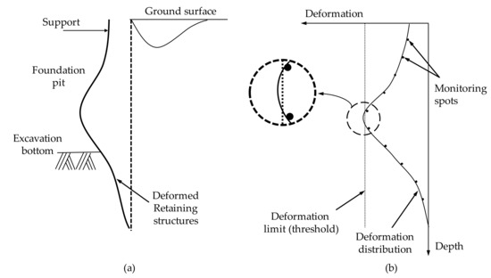 Illustration of deformed retaining structures in foundation pits. (a) Vertical deformation. (b) Failure occurring at unmonitored locations.
